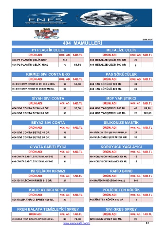 404 SIVI CONTA KIRMIZI 45 GR EKO MODEL 36 55,00 404 PAS SÖKÜCÜ 200 ML 30