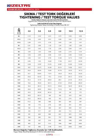 TEKNİK BİLGİLER / TECHNICAL DATA Moment Değerleri Yağlanmış Civatalar İçin %20 Azaltılmalıdır. Torgue Volues Should be Decreased of 20% for Lubricated Screws 264