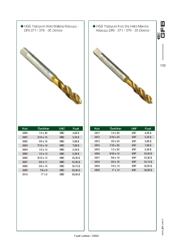 Kod Özellikler UNC Fiyat Kod Özellikler UNF Fiyat